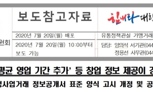 공정거래위원회(위원장 조성욱, 이하 공정위)는 ‘가맹사업거래 정보공개서 표준 양식에 관한 고시*’(이하...