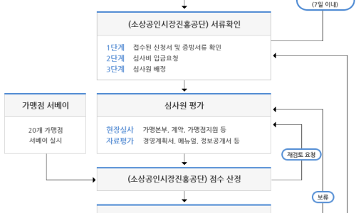 본문으로가기 로그인 안내드림 지식드림 소상공인마당 우수프랜차이즈 수준평가 프랜차이즈 체계구축 신청내역 수준평가 수준평가 지원사업 문의 042)363-7742, 7744, 7747 (월~금요일 9시~18시) 수준평가 홈 > 수준평가 > 수준평가 신청요건 정보공개서를 등록한 브랜드 중 직영점 1개와 가맹점을 10개 이상 운영 중인 프랜차이즈 가맹본부 또는 가맹점이 20개 이상인 프랜차이즈 가맹본부 * 가맹사업 업력 1년 미만, 완전자본잠식 상태, 대기업인 가맹본부 제외 진행절차 (가맹본부)신청 대상 : 정보공개...