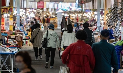 서울 종로구 광장시장을 찾은 시민들이 상품을 살펴보고 있다. 뉴스1 신종 코로나바이러스 감염증(코로나19) 확산세가 둔화하고 사회적 거리두기가 완화되면서 이달 소비자심리가 큰 폭 반등했다. 28일 한국은행이 발표한