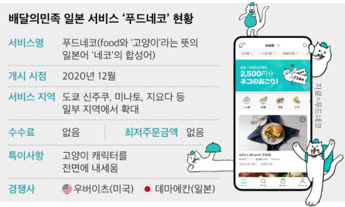 일본판 배민 ‘푸드네코’ 작년 12월 서비스 개시 ‘서비스료·기본배달료·최소주문금액=0’ 공격적 마케팅 韓 배달료, 점주·소비자가 나눠내고 최소주문금액 있어 '서비스료, 기본배달료, 최소주문금액 0원'. 지난해 12