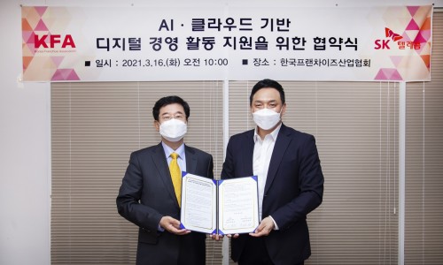 SK텔레콤은 한국프랜차이즈산업협회(KFA)와 프랜차이즈 산업 경쟁력 강화를 위한 업무협약(MOU)을 체결했다고 16일 밝혔다. 회원사 1100개 이상이 모인 KFA는 건전한 프랜차이즈 사업문화 정착과 국내 브랜드 세