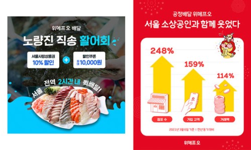 위메프가 자사 배달∙픽업 서비스 '위메프오'를 통해 '2시간 내 신선배달' 상품을 내놨다.(좌) 위메프오는 지난해 12월 서울시 제로배달 유니온 참여와 동시에 정률제 수수료율을 5%에서 2%로 낮추며 착한