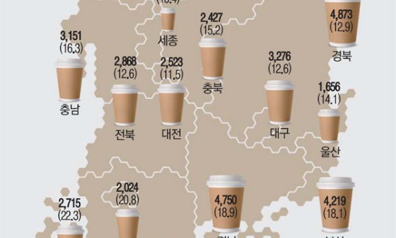 23% 증가…199가구당 1곳꼴 전국평균 수치보다 훨씬 많아 커피 수요 확산 추세도 한몫 1인당 소비량 세계평균 3배 작년 수입액 7억달러 돌파 시장 ...