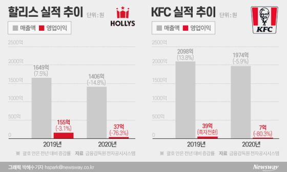 KG그룹이 운영하는 KFC와 할리스가 지난해 나란히 영업이익이 급감하며 부진한 성적표를 받아 들었다. 신종 코로나바이러스 감염증(코로나19)...