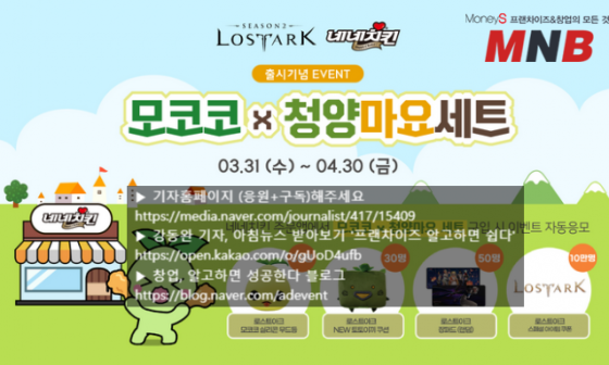 네네치킨, 로스트아크와 콜라보…’모코코X청양마요세트’ 출시강동완 기자 | 조회수 : 3,176 | 2021.03.3...