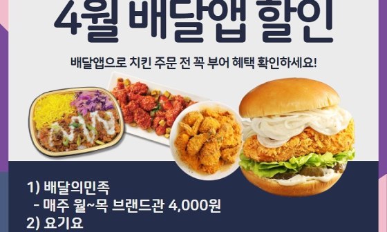 ▶ 부어치킨, 4월에도 푸짐하게 '배달앱' 할인행사로 즐겨요