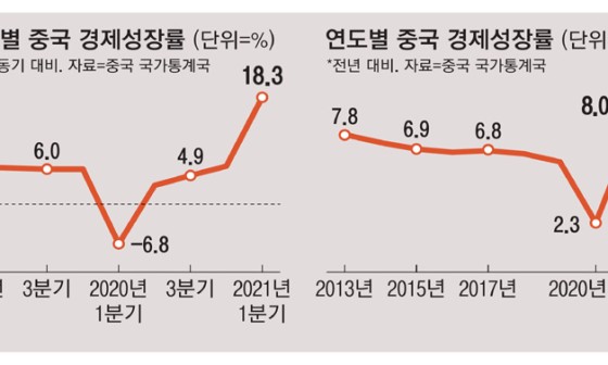 작년 -6.8%서 V자반등 성공 올 8%대 성장률 청신호 켜져 중국의 1분기 경제성장률이 경기부양 정책과 기저효과에 힘입어 30년 만에 최고치를 기록...