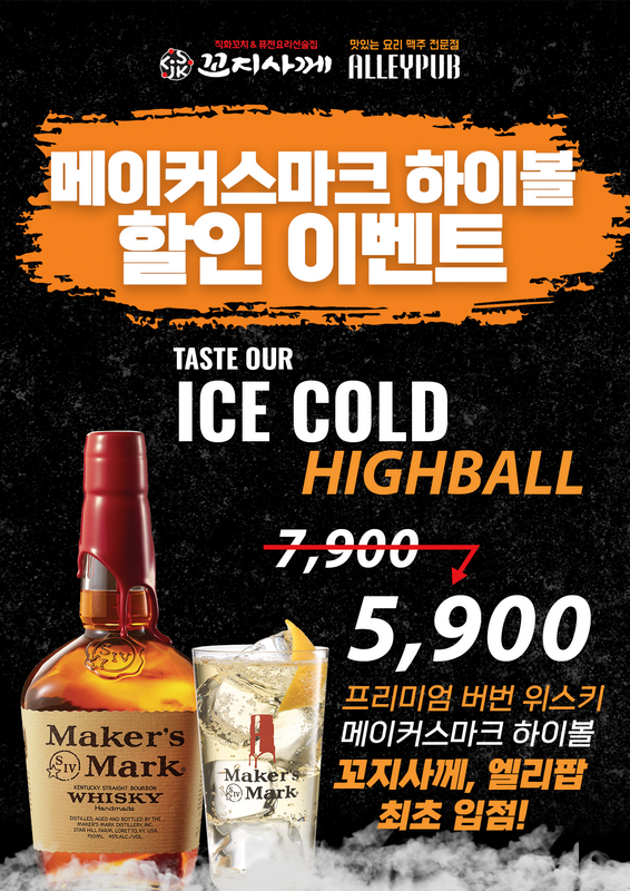 '꼬지사께' 와 '엘리팝'은 프리미엄 버번 위스키 메이커스마크 단독입점을 맞아 7,900원의 메이커스마크 하이볼을 5,900원에 만나볼 수 있는 할인행사를 진행한다.