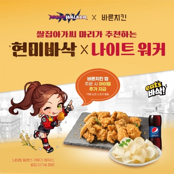 외식 프랜차이즈 브랜드로 ‘바른치킨’은 오는 21일까지 (주)넥슨의 액션 RPG 게임 ‘나이트 워커(Night Walker)’와 제휴 프로모션을 진행한다.