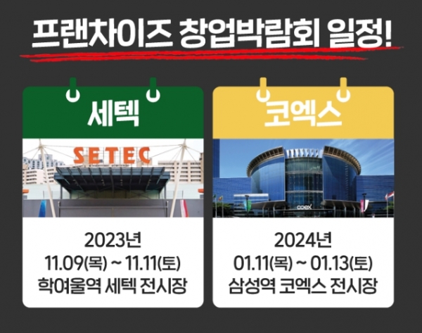 프랜차이즈 식품 외식 전시박람회 주관업체인 '월드전람'이 프랜차이즈 창업박람회 11월 세택(SETEC, 서울무역전시장)와 2024년 1월 코엑스 창업박람회 참가희망 업체를 대상으로 동시 참여 최대...