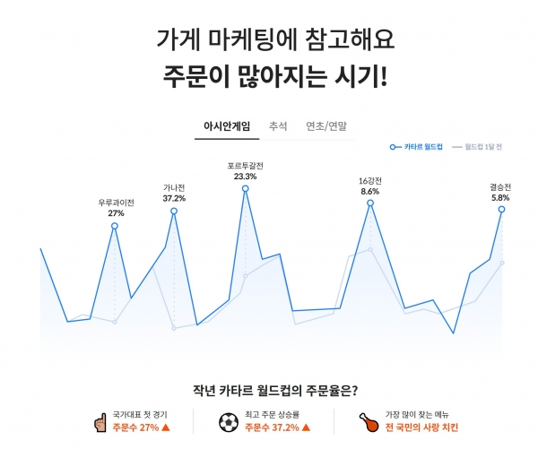 실제 지난해 카타르 월드컵 기간 중 국가대표 경기가 있던 날에는 주문량이 전월 대비 37.2% 늘었다. 또 작년 추석 대체휴일에는 주문수가 1주 전 대비 28.8% 증가한 바 있다. 올 추석 연휴는 임시공휴일과 개천절에 배달을 찾는 고객이 많을 것으로 예상됐다.