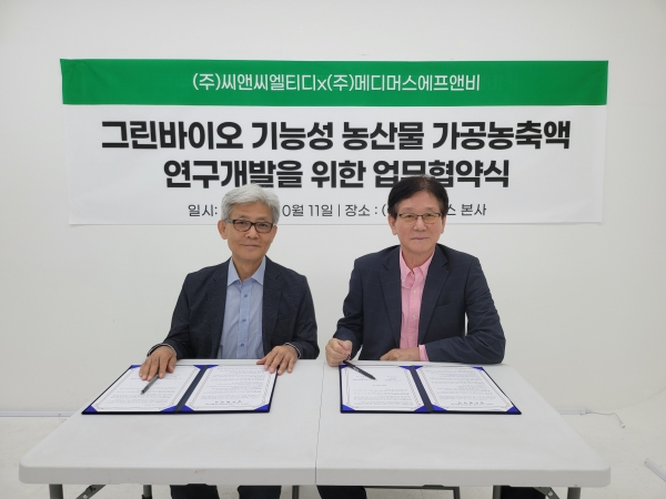 그린바이오 푸드&베이커리 플랫폼 전문기업인 메디머스에프앤비(대표 박진영)가 씨앤씨엘티디(대표 이의종)와 함께 그린바이오 기능성 농산물 가공농축액 연구개발을 위한 업무협약을 지난 11일 체결했다고 밝혔다.
