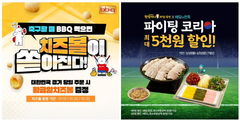 15일(월) 저녁 '2023 AFC 카타르 아시안컵(이하, 아시안컵)' 대한민국 축구 국가대표팀의 첫 경기를 앞두고 피자, 커피, 편의점 등이 다양한 할인과 무료배달 및 무료음료 제공 등의 다양한 마케...