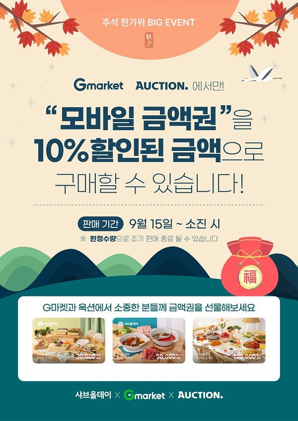 샤브올데이, 추석 맞아 G마켓·옥션과 모바일 상품권 할인 이벤트 진행 [ 강동완 기자 ]
