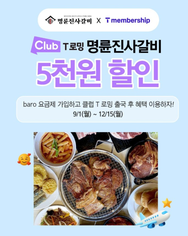 명륜진사갈비, SKT 클럽T 회원 대상 ‘자유이용권 5천원 할인’ 프로모션