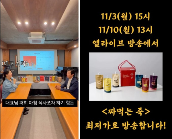 이번 할인 방송은 오는 11월 3일(월) 오후 3시와 11월 10일(월) 오후 1시, 두 차례에 걸쳐 진행된다. 방송에서는 죽이야기의 대표 메뉴인 짜먹는 죽 6가지 맛을 다양하게 선보이며, 방송 중 한정 수량 특가 혜택도 함께 제공할 예정이다.