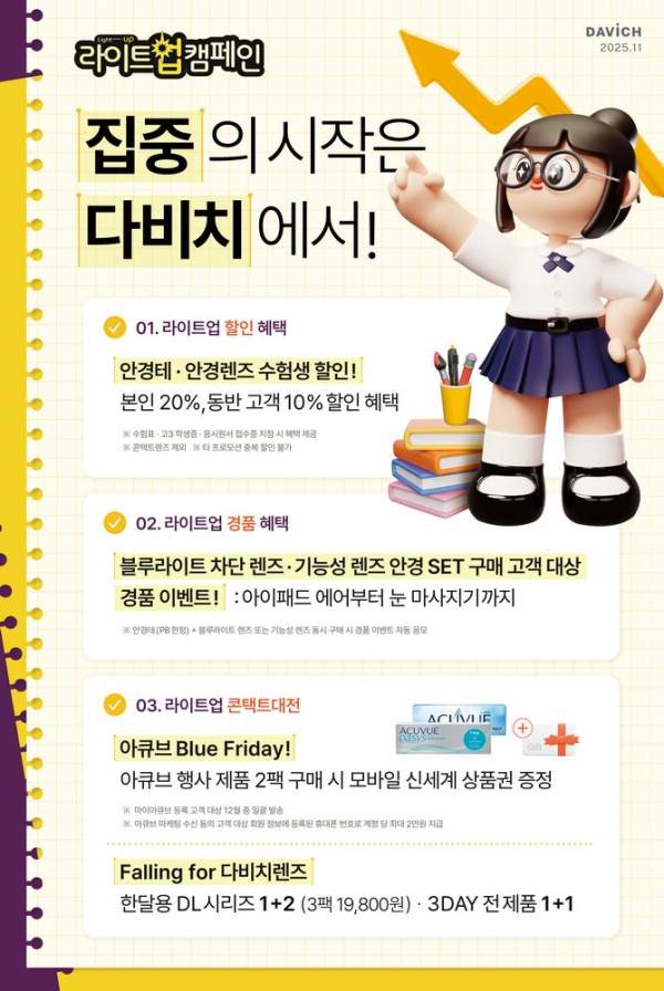 다비치안경, 11월 ‘Light Up 프로모션’ 실시… 수험생 할인·풍성한 경품 이벤트