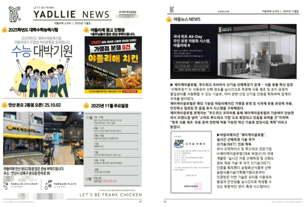 야들리에치킨, 11월 소식지 발행 … 지역 상권 확장 이어 식품 유통 자동화 기술까가맹 분쟁 0건의 안정 창업 모델… 실시간 산패측정 기술로 스마트 품질관리 실현