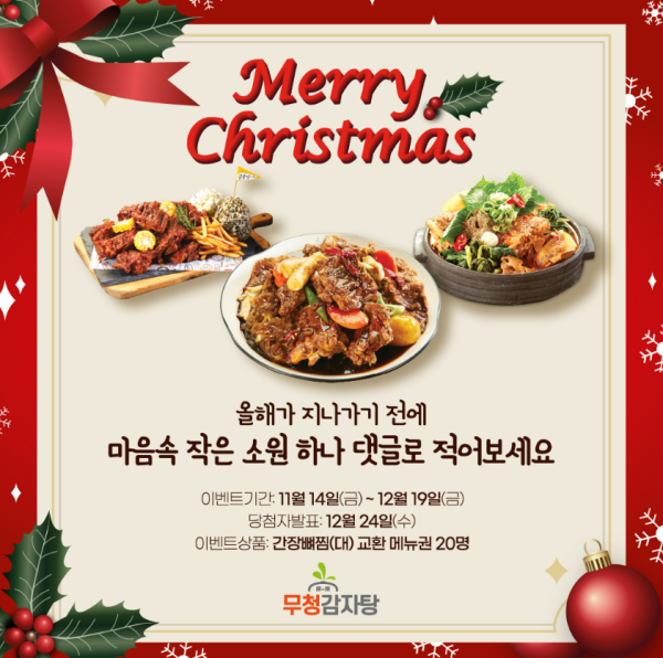 감자탕 프랜차이즈 브랜드 '무청감자탕'이 연말을 맞아 고객 참여형 크리스마스 이벤트를 진행하며 따뜻한 겨울 분위기를 더하고 있다.