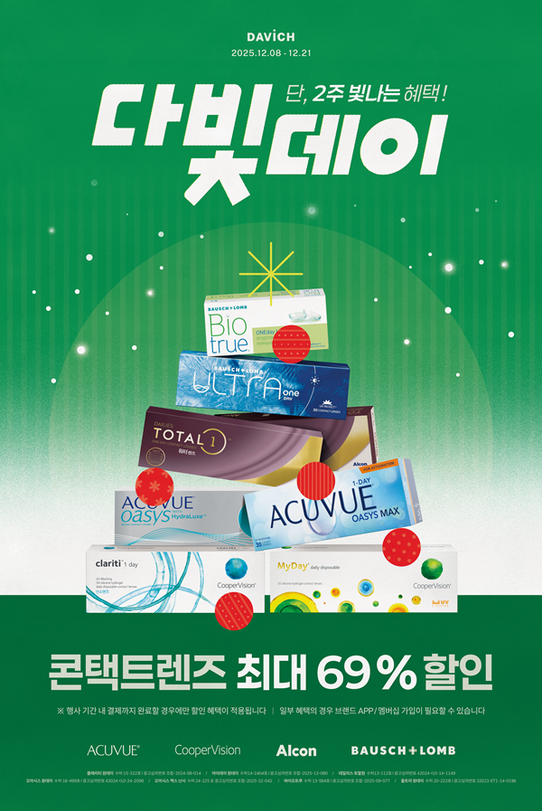 다비치안경, 12월 21일까지 다빛데이 프로모션 진행 아큐브, 쿠퍼비전, 알콘, 바슈롬 등 다양한 브랜드 콘...