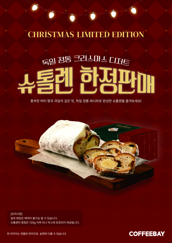 카페 프랜차이즈 커피 브랜드 커피베이는 이번 미니 슈톨렌 출시를 통해 시즌 한정 디저트 경쟁력을 강화하고, 커피와 함께 즐길 수 있는 디저트 카테고리를 지속적으로 확장해 나갈 계획이다.