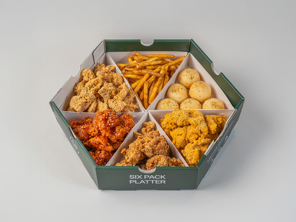 씩스팩은 6칸으로 구분된 육각형 박스에 치킨과 사이드 메뉴를 함께 담은 구성으로, 별도 그릇 없이 나눠 먹을 수 있도록 설계된 것이 특징이다.